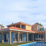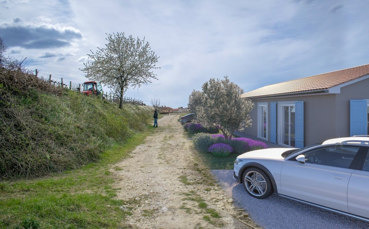 Newly built house with pool -172 m2 – surroundings Buje – beautiful panoramic view – for sale. Quiet location in a small romantic village with 2 excellent restaurants, in the surroundings many wineries, the mild climate is well suited for wine and olive growing. Close to the Slovenian border. Detached house with approx. 172 m² living space with 3 bedrooms and 3 bathrooms, the plot has a size of 681 m², pool 35 m². Ground floor: Kitchen with dining area, living room, guest toilet, storage room, covered terrace. Upper floor: Three bedrooms, each with en-suite bathroom, terrace. High quality, ceramic and parquet floors, underfloor heating and fan convectors in all rooms. The property is under construction, so changes can be made at the time of purchase according to the client's wishes.