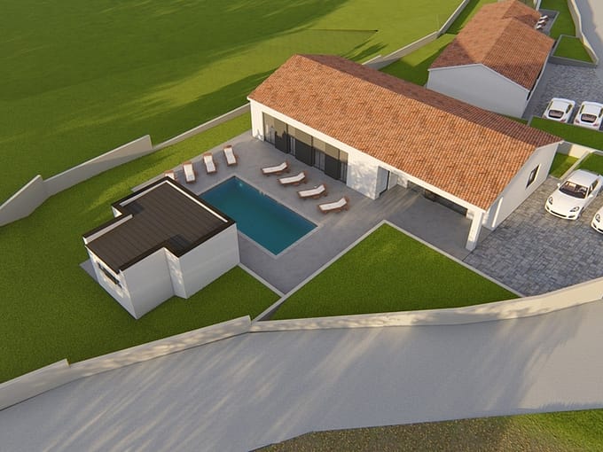 Ekskluzivna nova kamena vila sa bazenom i sportskim terenom na mirnoj poziciji U idiličnoj unutrašnjosti Istre, oko 16 km od plaža u Vrsaru i Rovinju, oko 9 km od Kanfanara – malog mjesta sa trgovinama. Vila Elena : godina gradnje 2016 sa 359 m² stambene površine i zemljištem sa 880 m². U prizemlju je luksuzni dnevni boravak sa kaminom, blagovaonica sa stolom i stolicama, kompletno opremljena rustikalna kuhinja i WC , dvije spavaće sobe, svaka sa kupatilom. Prvi kat:na prvom katu su tri sobe sa bračnim krevetom svaka sa kupatilom. Dvije sobe imaju izlaz na terasu sa prekrasnim panoramskim pogledom i pogledom na more u daljini. Oprema : centralno grijanje, klima, namještaj je mješavina modernog i vintaž-namještaja, odlično opremljeno, djelomično sa vidljivim kamenim zidovima, drvenim gredama, podnim grijanjem, Klima, WLAN. U vrtu je bazen i sa tušem ( topla voda), natkriveni gril sa stolom, vanjski WC sa tušem, mjesto za ležaljke uz bazen, ograđeni vrt i parking. Mogućnost korištenja dobro opremljene sportske zone – nogomet, rukomet, košarka, odbojka, dva tenis terena, boćalište, stolni tenis i dječje igralište. Vila ima kategorizaciju. U cijeni je PDV, tako da se kod kupnje preko hrvatske firme PDV ne plaća te je cijena € 825.000,00 namješteno