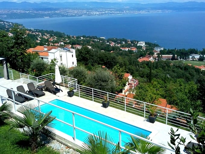 KB-465 samostojeća kuća sa 5 stanova iznad Lovrana prekrasan i nesagradiv pogled na more bazen I njegovan vrt