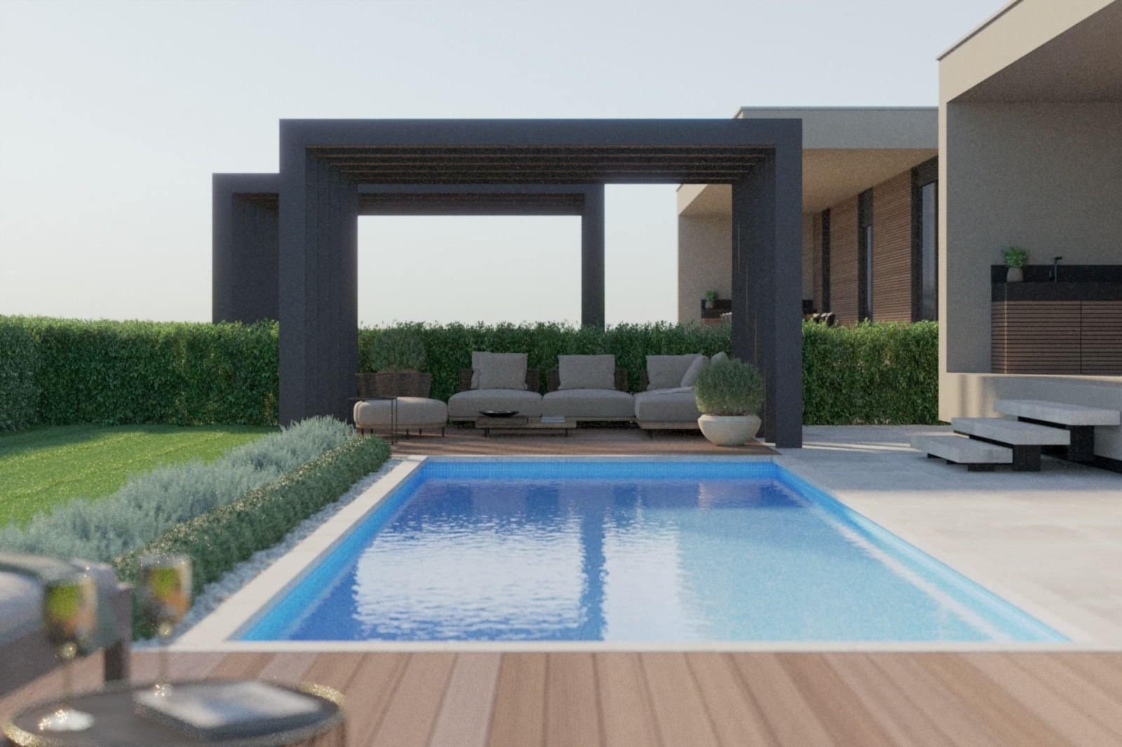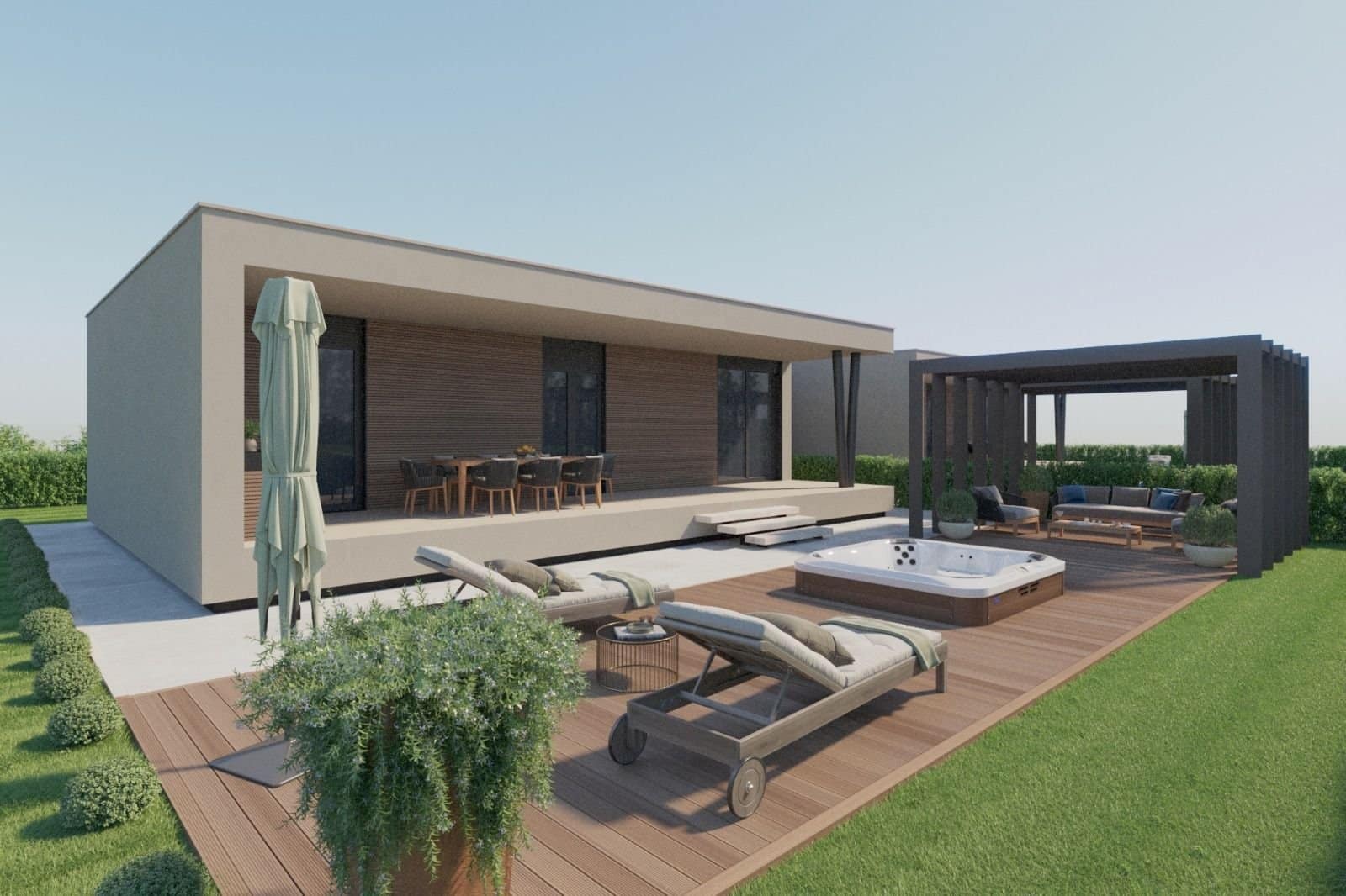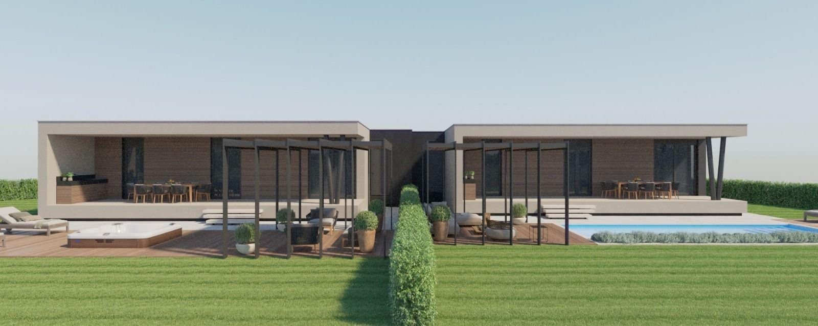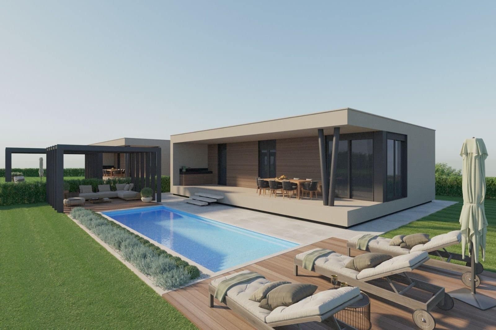 Moderne Villen – ca. 5 km von Porec und Meer – ruhiger kleiner Ort Kleine Anlage mit 4 Doppelhäusern und 4 freistehenden Villen jeweils mit Pool, Fertigbauweise mit Metallkonstruktion, Baubeginn ca. Sommer 2023. Doppelhaushälfte mit ca. 450 m² Grund, Nettowohnfläche ca. 100 m² : Wohnzimmer mit Kϋche und Essbereich, 2 Schlafzimmer, Bad, WC, Abstellraum, Terrasse, Flur. freistehende Villen mit ca. 700 – 850 m² Grund, Nettowohnfläche ca. 190 m² : Wohnzimmer mit Kϋche und Essbereich, 4 Schlafzimmer, 4 Bӓder, WC, Abstellraum, Terrasse, Pool von 24 – 34 m² Klima-Anlagen in den Zimmern, Fußbodenheizung im Bad. Ausstattungswünsche können berücksichtigt werden. Baubeginn erfolgt nach Kauf, Bezahlung nach Baufortschritt